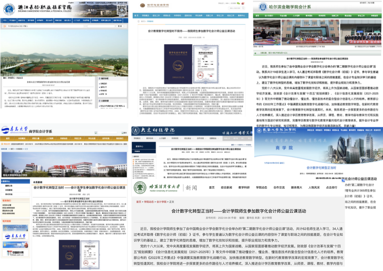 本次活动遍及全国30余个省区市,涵盖华北、东北、华东、华中、华南、西南和西北七大区域,走进600余所院校,其中包括东北财经大学、中山大学、西安交通大学、南京审计大学、北京工商大学、北京师范大学等本科院校,浙江长征职业学院、贵州职业技术学院、哈尔滨剑桥学院、北京劳动保障职业学院等高职(高专)院校,数百位院校校领导及老师参与组织,数万名会计、审计、财务管理等财会相关专业学生进入线上学习,考试并取得《数字化会计师》(初级)证书,并被纳入中国数字化财会紧缺人才库。