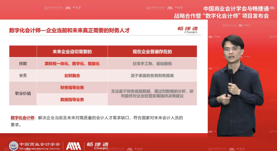 畅捷通总裁杨雨春致辞中国商业会计学会会长助理、对外经济贸易大学浦军教授发表题为《会计教育 路在何方》的演讲,他强调“会计教育面对的对象是整个商科领域里最广泛的群体,会培机构首先碰到困难是能否提供适销对路的符合学员的产品,其次是如何拓宽获得学员渠道继而影响教育其心智。在数字时代,很多企业的应用场景已经不可逆转的发生了变化,企业的用人需求也在变化。我们所处的环境发生了变化,唯一做的事情就是要与时俱进,随之而变。财政部印发的《会计改革与发展“十四五”规划纲要》和《会计行业人才发展规划(2021-2025年)》,进一步明确了数字经济发展和社会数字化转型急需懂会计、懂业务、懂信息技术的复合型数字化会计人才。“三懂”型会计人才即数字化数字化会计师,无论从国家层面还是企业层面,对数字化会计师人才的需求与日俱增,企业数字化转型,财务先行,这些都离不开数字化会计人才的培养。”