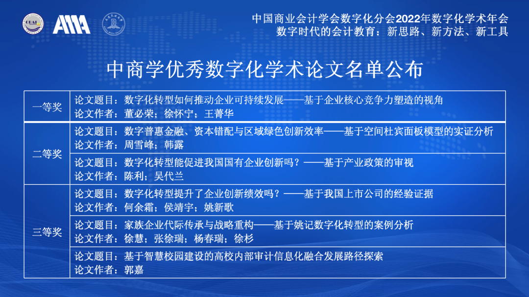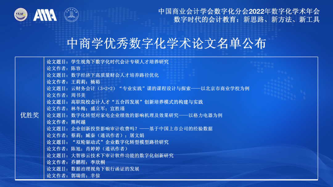 2022年8月14日,中国商业会计学会数字化分会2022年数字化学术年会圆满召开。学会副秘书长、数字化分会会长马瑞阳博士在“发布及授牌仪式”上公布了本年度数字化学术论文的获奖名单。本次征文近百篇,经初审和现场评审研讨,共评选出15篇优秀论文,其中,一等奖1篇、二等奖2篇、三等奖3篇以及优胜奖若干,现将优秀获奖论文名单公示如下: