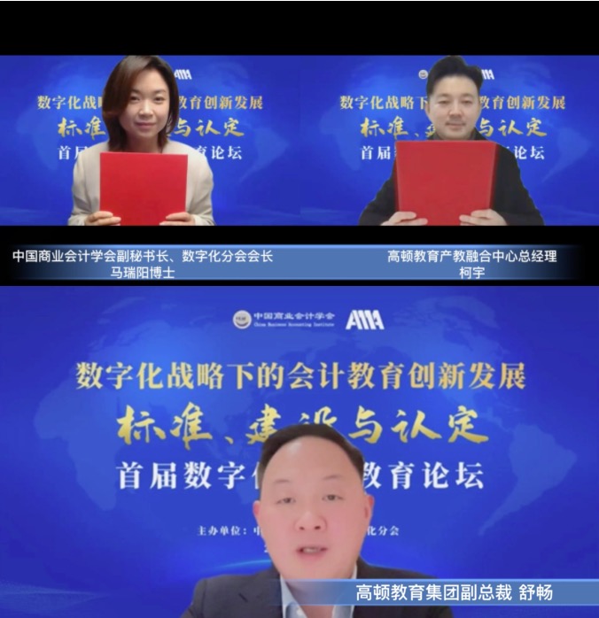在随后进行的“数字化会计教育认定机构授牌仪式”上,马瑞阳博士与高顿教育产教融合中心总经理柯宇共同签署合作协议,高顿教育通过评估并被授予“认定机构”牌匾。高顿教育集团副总裁舒畅在发言中表示,多年来,高顿教育作为财经教育行业的领军企业之一,已经为15万家企业提供财经教育服务,也与近400所高校开展校企合作。此次很荣幸成为中国商业会计学会数字化会计教育认定项目的认定机构。希望在与学会的深度合作中,共同打造提升工程,引领数字化行业升级的宏远愿景,发挥各自所长。在会计行业数字化转型标准建设、人才培养与认定等方面,共同承担起国家行业使命,为中国数字化会计行业培养出更多人才,为加快我国数字化转型升级出谋划策、贡献力量。