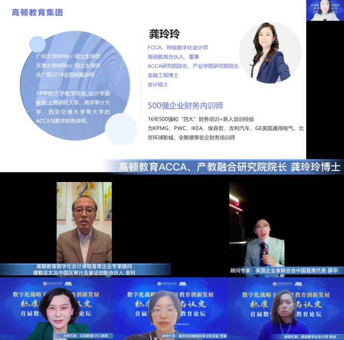 接着,高顿教育ACCA研究院院长、产教融合研究院院长龚玲玲进行《高顿教育数字化会计教育认定项目建设方案介绍》主题演讲,对数字化会计配套产品进行详细介绍。高顿教育围绕中国商业会计学会发布的《数字化会计职业能力框架》标准,依据《数字化会计师证书》的能力与技能框架,着手研发了配套的数字化会计教学体系及全套课程。对此,高顿教育“数字化会计”课程首席企业专家顾问——德勤亚太区审计及鉴证数据分析领导合伙人创新服务合伙人金科、英国企业家联合会中国首席代表薛华、见知数据CFO韩琦、唯你科技智能财务分析总监李颖、高级数字化会计师熊劲等诸多业内大咖发表观点给予肯定和认可。