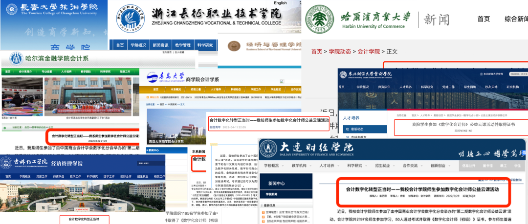 2021年7月起发起了面向全国院校师生的“数字化会计师公益云课”活动,旨在在《数字化会计教育标准》的制定下,联合国内会计教育领域著名专家、数字化会计实践专家及技术专家共同助推院校、教师生开展数字化会计教育教学工作,有效促进数字化会计人才技能水平、就业水平及岗位胜任力水平。自云课活动开展以来,得到了社会各界的帮助和支持,覆盖院校600余所万余名师生,师生们好评如潮,师生们纷纷表示“通过本次学习,弥补了课堂与职场之间的技能差距,在财会专业知识学习的基础上,建立起了数字化转型的思维方式,更提升了就业竞争力。”同时,一些院校在其官网上对公益云课活动的认可展开了积极宣传。