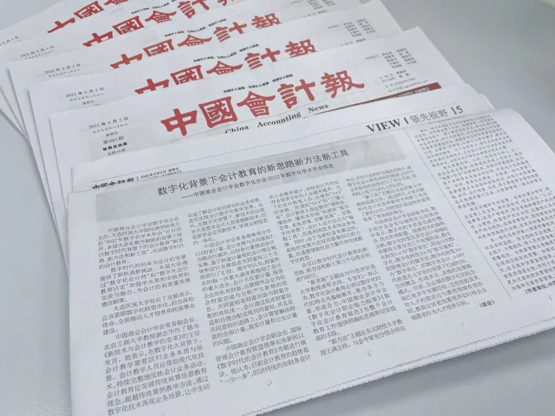 2022年9月2日,财政部《中国会计报》在“领先视野”专版深入报道中国商业会计学会数字化分会2022年数字化学术年会在报道。在报道中提到,数字化会计教育必须以数字化时代的特点为基础展开,集合各方力量,形成合力,中国商业会计学会《数字化会计职业能力框架》《数字化会计教育规范》为整个会计教育工作提供明确的思路和切实提高的手段。