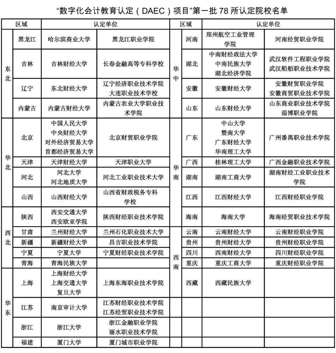 “数字化会计教育认定(DAEC)项目”以解决教育端会计人才培养质量与产业端数字化会计人才岗位需求不匹配的现实矛盾为核心目标,以教育部本科、高职教育评估体系为基础,依托《数字化会计职业能力框架》和《数字化会计教育规范》两项标准,建立育人、用人相统一的教育评价体系,通过组织开展数字化会计教育研讨峰会、产品审核、专家论坛、师资培训、学生大赛及职业测评等多种活动,搭建教育界和产业界的供需桥梁,有效向院校传递产业需求,同时,为院校形成产教融合协同发展闭环提供专业咨询建议及相关资源支持。2022年8月份,中国商业会计学会公布了第一批认定院校名单,覆盖全国23个省、5个自治区、4个直辖市的78所认定院校(其中,43所本科院校,35所职业院校)和300余所建设院校。