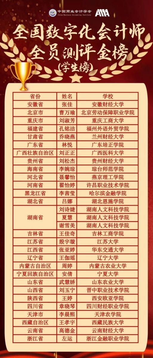 为鼓励成绩优秀的考生,配合开展对具有发展潜质的考生进行跟踪评价,中国商业会计学会数字化分会推出了“全国数字化会计师全员测评金榜”,以月度为榜单更新周期,以测评最高分数为排名依据,各省总分名列第一(含并列者)的学员列入全国金榜,截止到2023年5月31日,30名学员突出重围成功进入全国数字化会计师全员测评金榜(学生榜)。