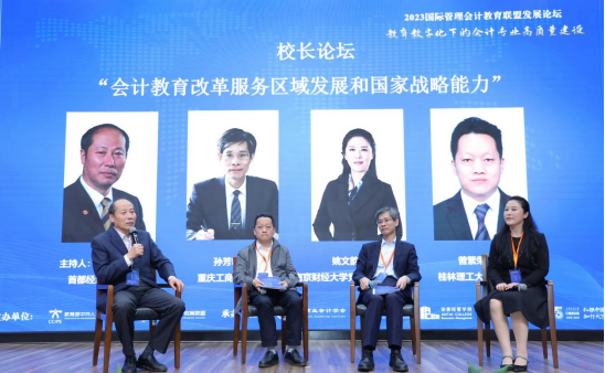 “校长论坛”环节由首都经济贸易大学杨世忠教授主持。南京财经大学党委常委、副校长姚文韵教授,重庆工商大学原校长孙芳城教授,桂林理工大学总会计师曾繁荣教授围绕“会计教育改革服务区域发展和国家战略能力”主题展开研讨。姚文韵教授表示,应培养更多具有大数据思维和决策能力的高端会计人才,为经济发展提供人才支撑。孙芳城教授指出,会计教育改革应贯彻创新、协调、绿色、开放、共享的新发展理念。曾繁荣教授认为,会计专业改革要以现代产业学院为抓手,推动学科、专业、课程一体化更新发展。