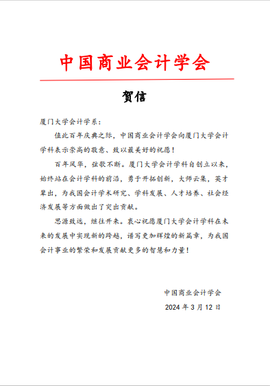 厦门大学会计学科百年回眸与共创一流活动筹备期间,中国商业会计学会第一时间向厦门大学会计学系表示祝贺并发来贺信,受杜兴强教授邀请,学会常务副会长谢志华教授、常务副秘书长黄冬根代表中国商业会计学会参加了本次大会,学会副会长张新民教授、王开田教授、笑雪主编,智能会计分会会长王爱国教授,智能财务分会会长张俊瑞教授、副会长王彦超教授,以及众多学会常务理事都在现场共同见证“厦大会计 百年辉煌”。祝愿厦大会计越办越好,为中国会计学科建设做出更大的贡献,迎来更加辉煌灿烂的下一个百年。
