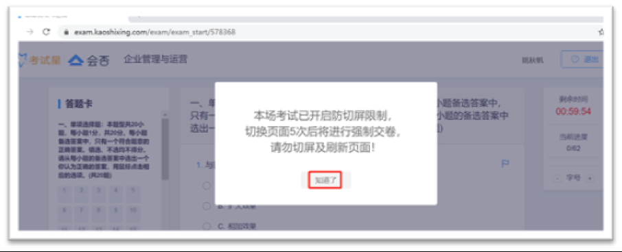 五、进入考试页面后,点击下图中的“知道了”:本考试防作弊措施之一,对切屏次数有限制,超过次数规定,自动强制交卷;建议考试时不要按ESC键(一般在电脑键盘的左上角),同时关闭其他所有电脑应用,比如微信等,以防止无意中切屏。