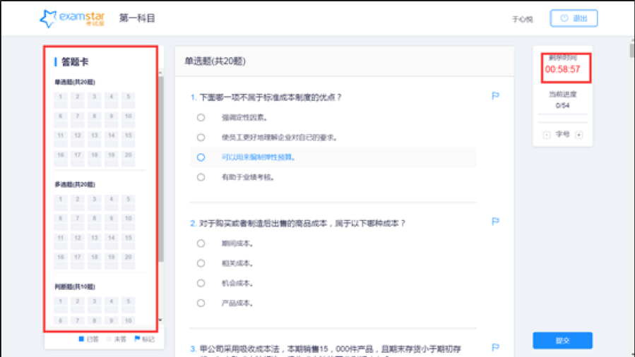 六、答题页面的左边是答题卡--显示题目的数量和答题情况;右上角是本科目剩余答题时间;选择答案时,点击相应的答案即可。