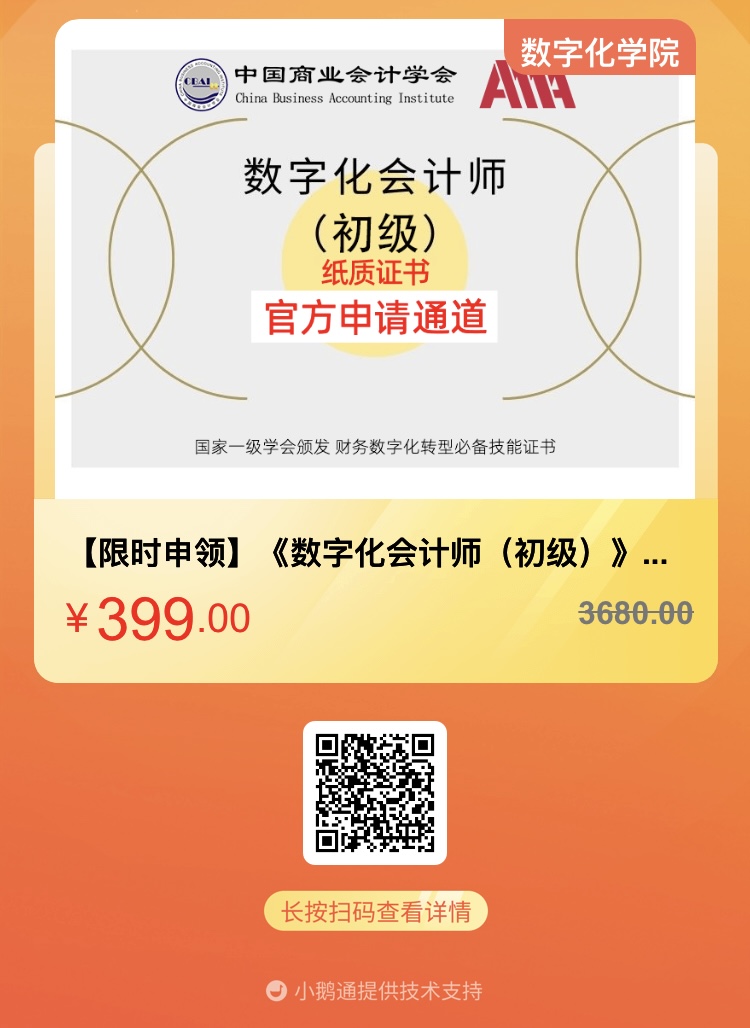2、纸质证书长期有效,为便于广大电子证书持证学员延长证书有效期,现特开辟纸质证书补申请限时通道(即日起至2023年3月31日),仅面向已经考试通过的初级电子证书持证学员,申领价格为399元,除初级证书外,还可免考免费获得《数字化会计师(初级实操)证书》纸质证书;