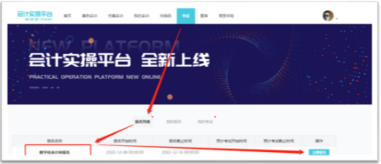 点击页面上方的“考试”,再点击中间的“报名列表”,最后点击下方“数字化会计师报名”最右侧的“立即报名”(填写个人信息,请填写真实姓名和手机号)