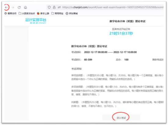 如果开考时间还未到,系统将会显示距离考试开始还有多久,如果退回,请点击左上角的“左向箭头”
