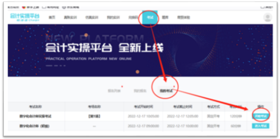点击中间最右侧的“我的考试”,就会显示考试信息,点击最右侧的“开始考试”,进入考试页面