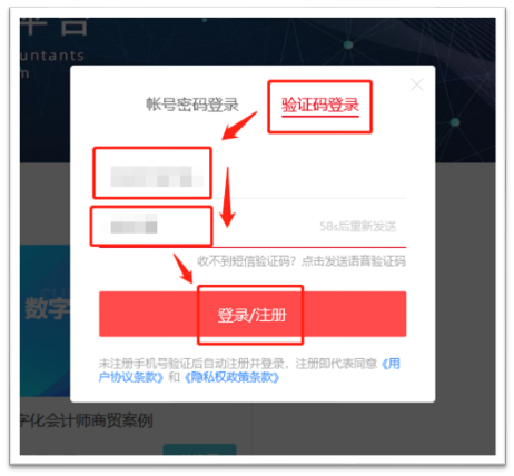 点击“验证码登录”,然后依次填写手机号(必须是报名时登记的手机号)和验证码,最后点击“登录/注册”