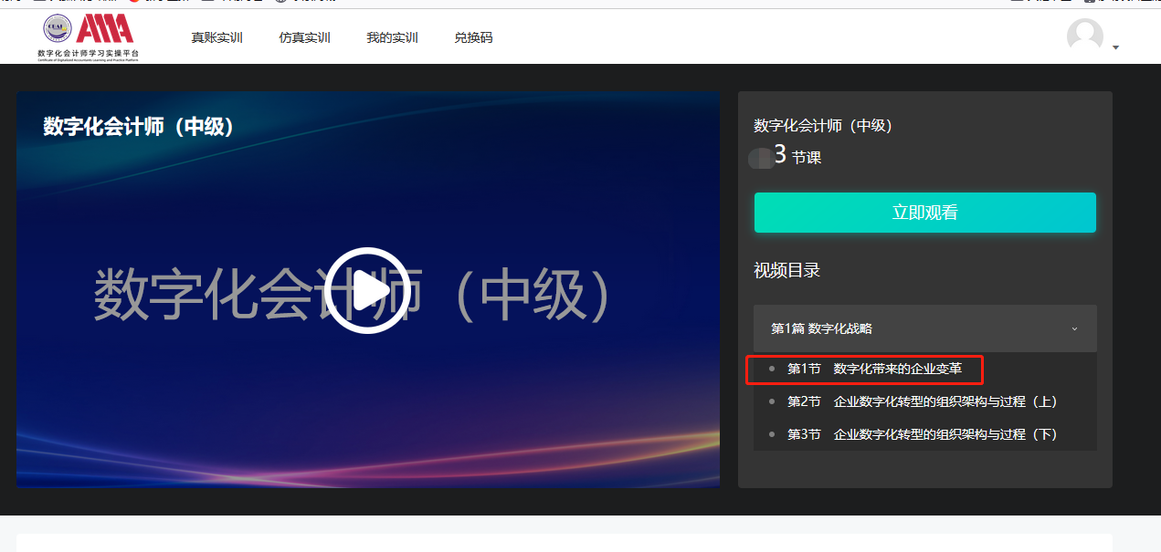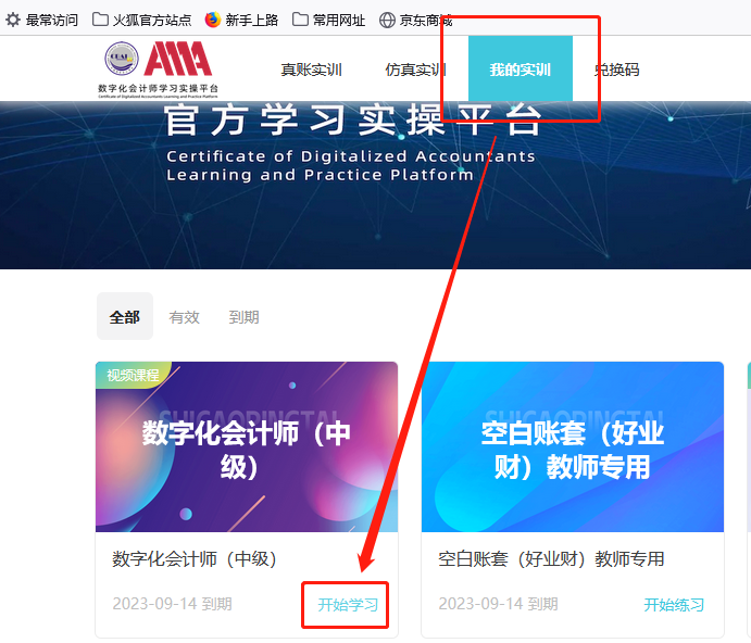 点击上方“我的实训”模块,下方就会显示“数字化会计师(中级)”,点击“开始学习”