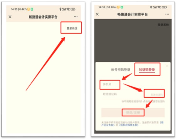滑到手机页面最右端,点击右上角的“登录系统”,选择验证码登录或账号密码登录(账号、密码同电脑端)
